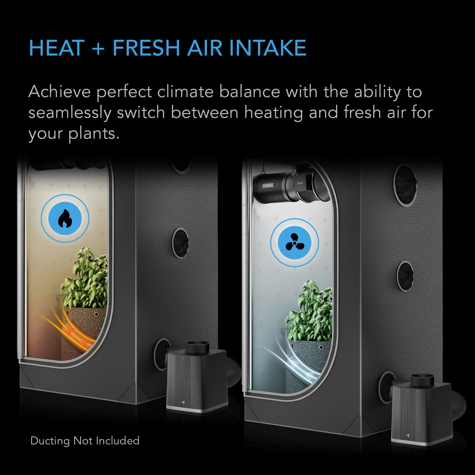The system’s individual PTC plates with PWM control deliver 10 true heat levels, maintaining consistent, energy-efficient warmth. Switch seamlessly between heat and fresh-air intake outputs to fine-tune your environment—warming your space when temperatures drop or drawing in cooler air to stabilize conditions. This dynamic range provides the versatility needed to sustain optimal growth year-round.