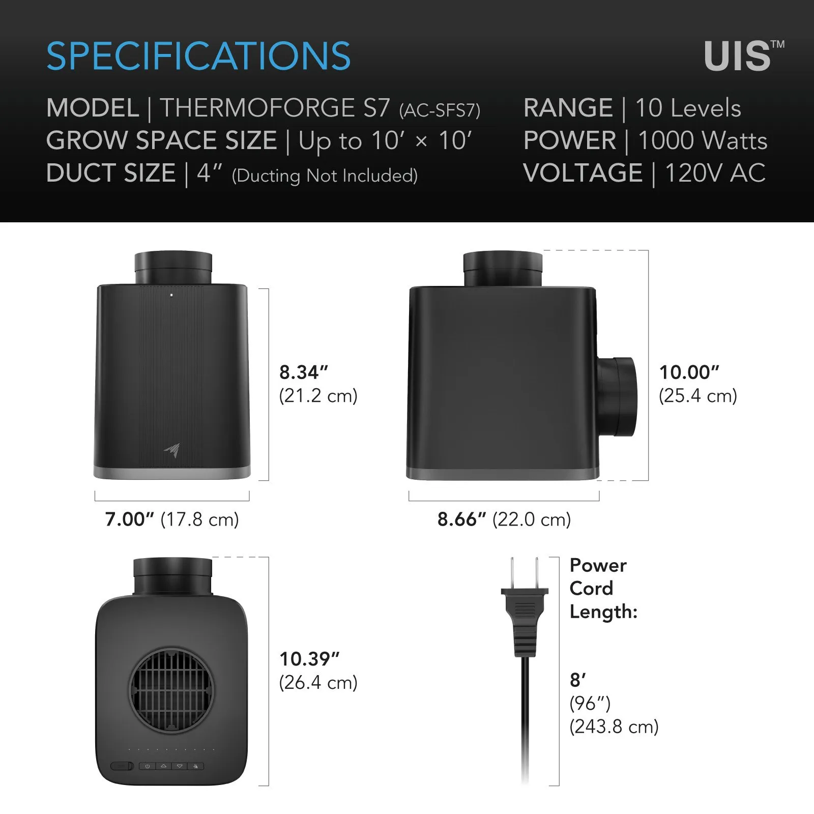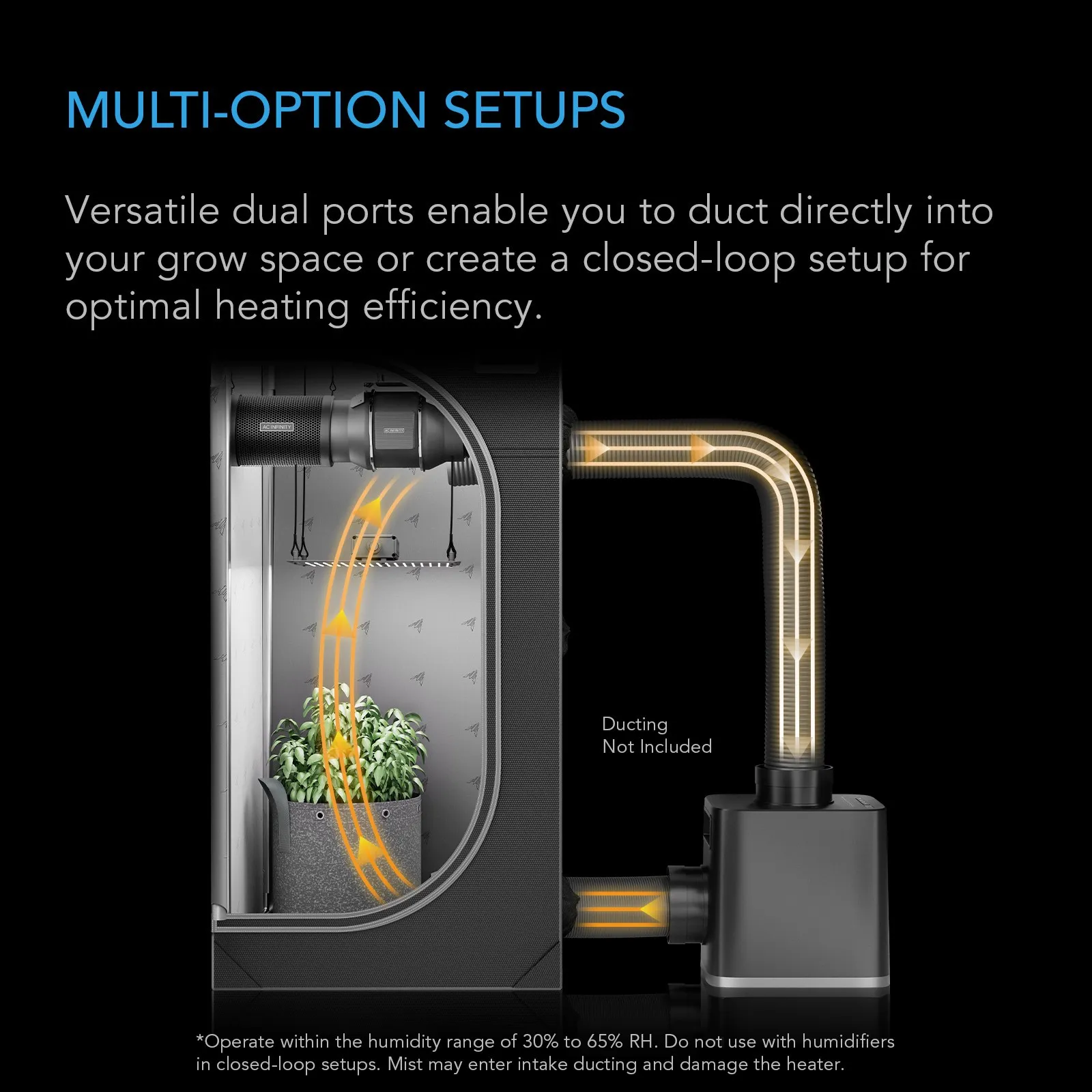 Experience precision-engineered climate management with this powerful 1000W AI-driven heater. Designed to optimize growth through every stage, it automatically adjusts temperature, airflow, and VPD to maintain your target environment. Individual PTC plates with PWM control deliver 10 true heat levels or fresh air intake for balanced conditions, while dual duct ports support both open- and closed-loop setups for versatile integration. This product is ETL-certified with safety features including tip-over alarms, flame-retardant materials, and overheat protection with auto-restart it delivers performance you can trust. Designed exclusively for indoor use. Operate only in controlled environments with humidity between 30%–65% RH, including incoming airflow. Do not use outdoors or in high-humidity areas. Do not use with humidifiers in closed-loop setups. Mist may enter intake ducting and damage the heater. Plug heaters only into a grounded wall outlet with surge protection. Never use extension cords or power strips, as this may cause overheating or melting. Do not share the outlet with other devices.